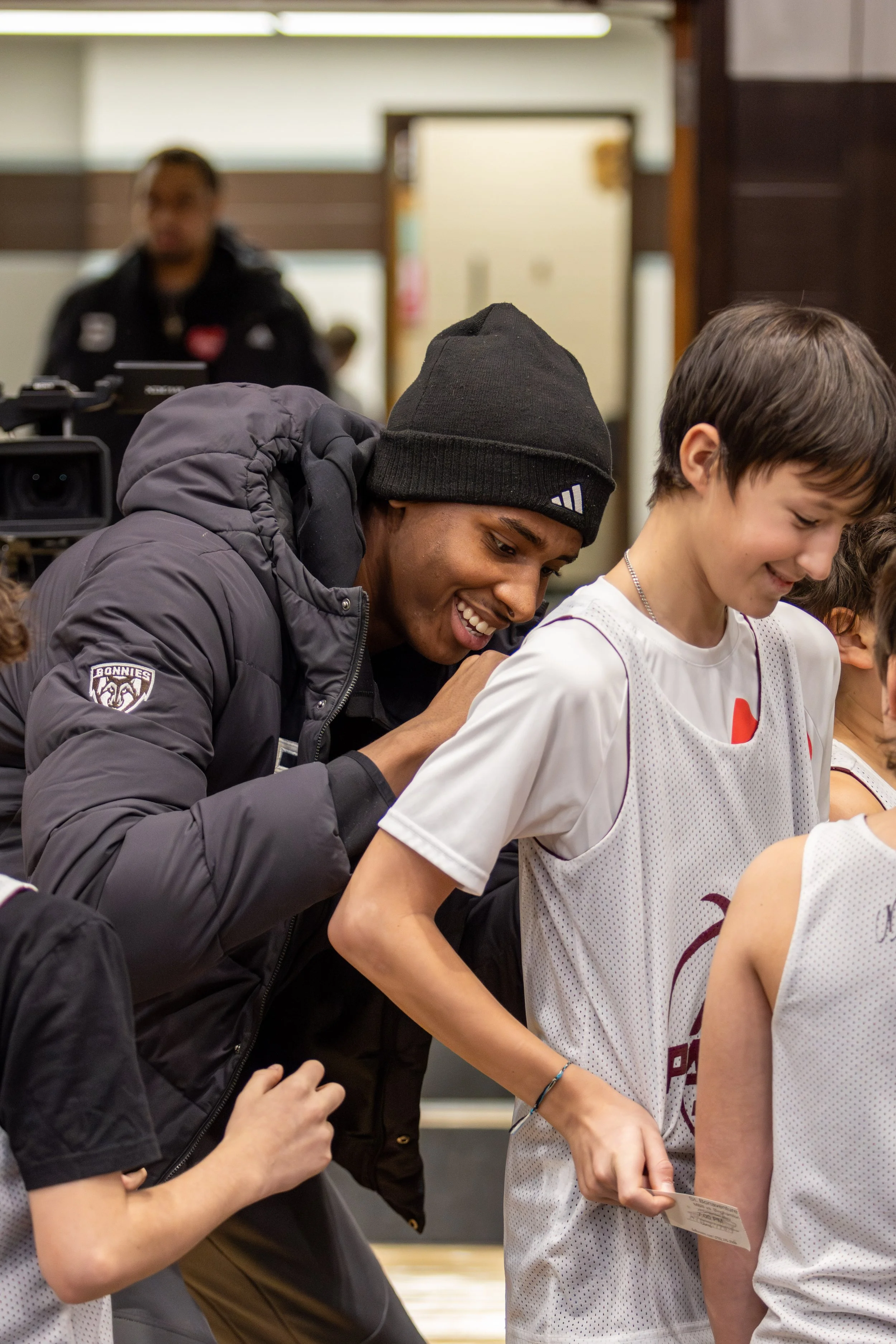 A young basketball player is signing autographs for children while smiling. An adult man, likely a coach or celebrity, is leaning over and watching, also smiling. They are indoors, in a sports setting.