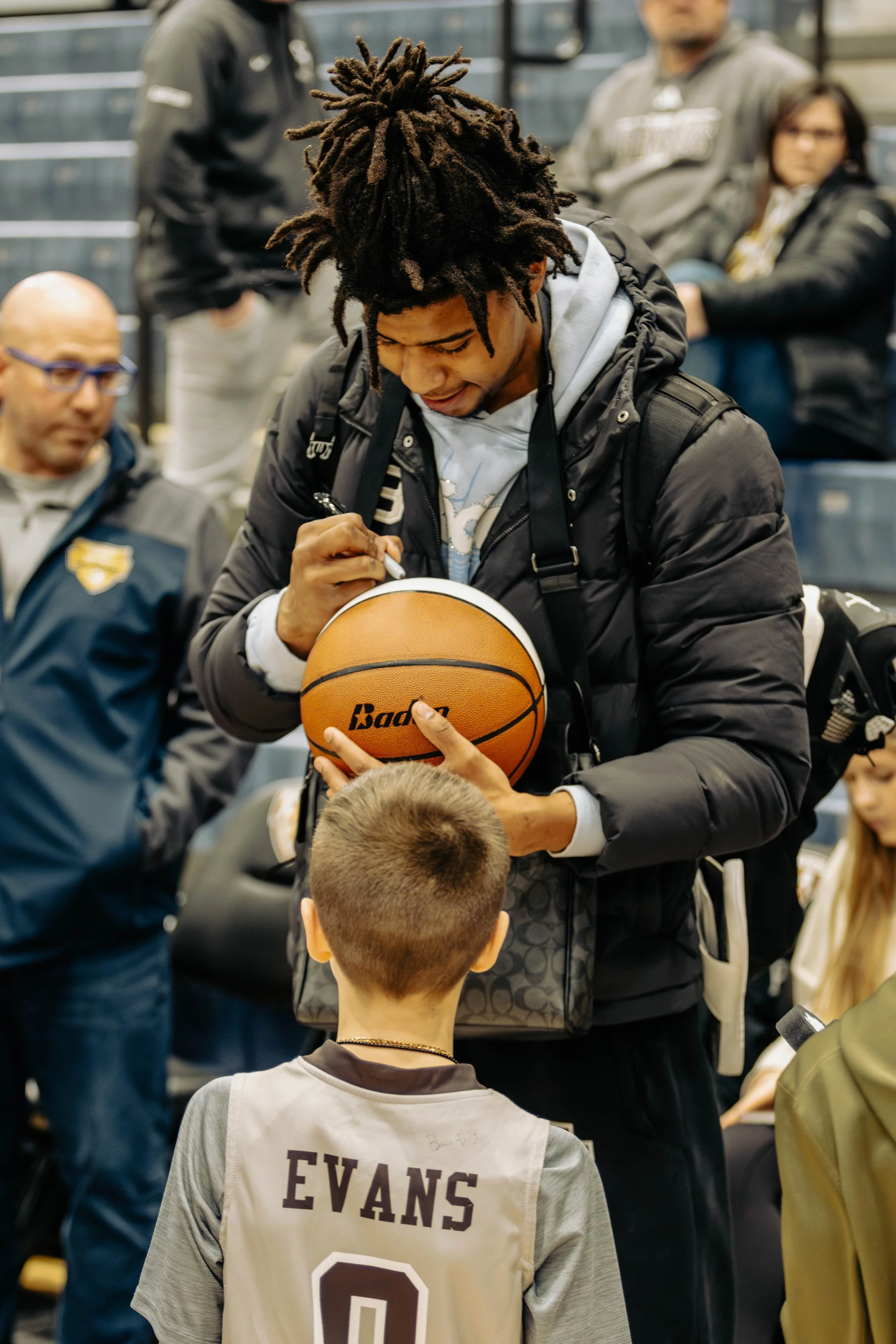 A young man with dreadlocks signing a basketball for a boy wearing a jersey that says 'Evans' and the number 0. The young man has a backpack and is surrounded by people in an indoor sports arena.