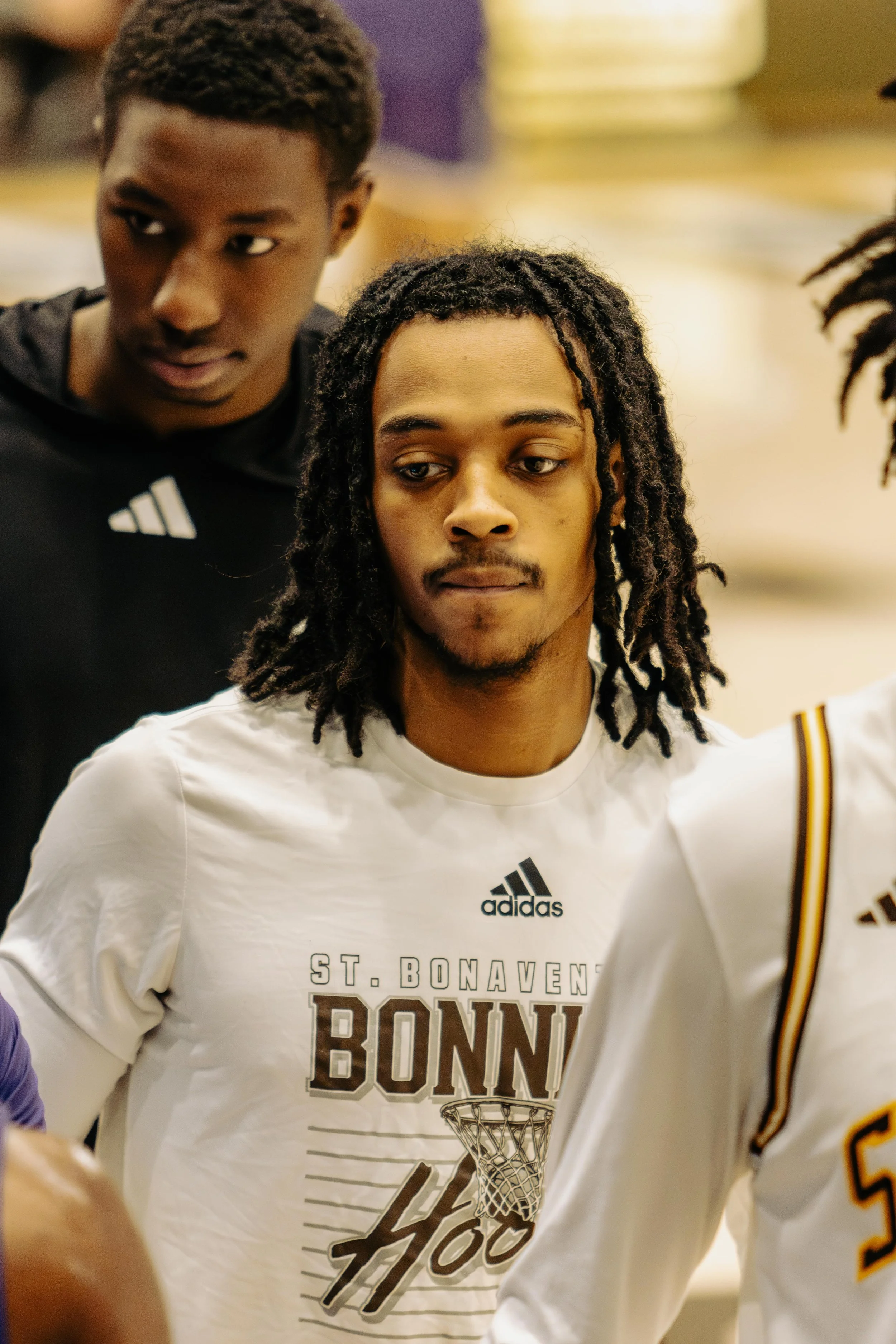 A young man with long dreadlocks wearing a white basketball jersey with 'St. Bonaventure Bonnies' and a basketball hoop logo, standing inside a gym. There is another young man with short hair in the background.