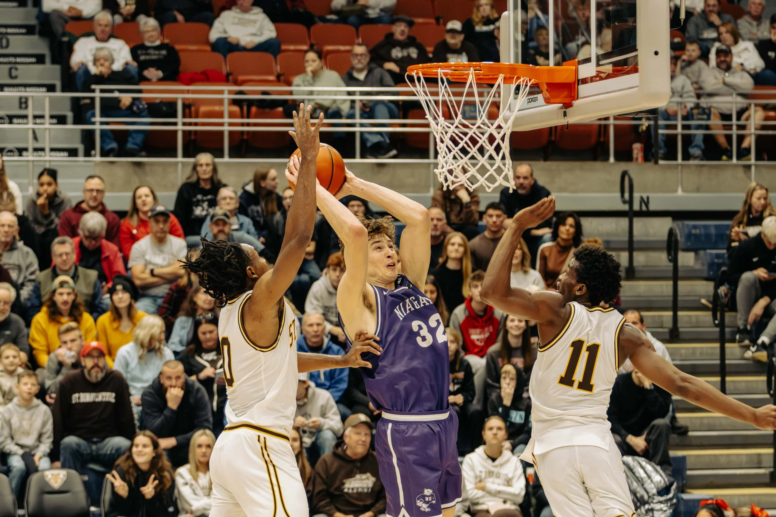 Two basketball players in white jerseys and one in a purple jersey compete near the basket. The player in purple is attempting a shot while two players in white are trying to block it. The crowd watches from the stands in the background.