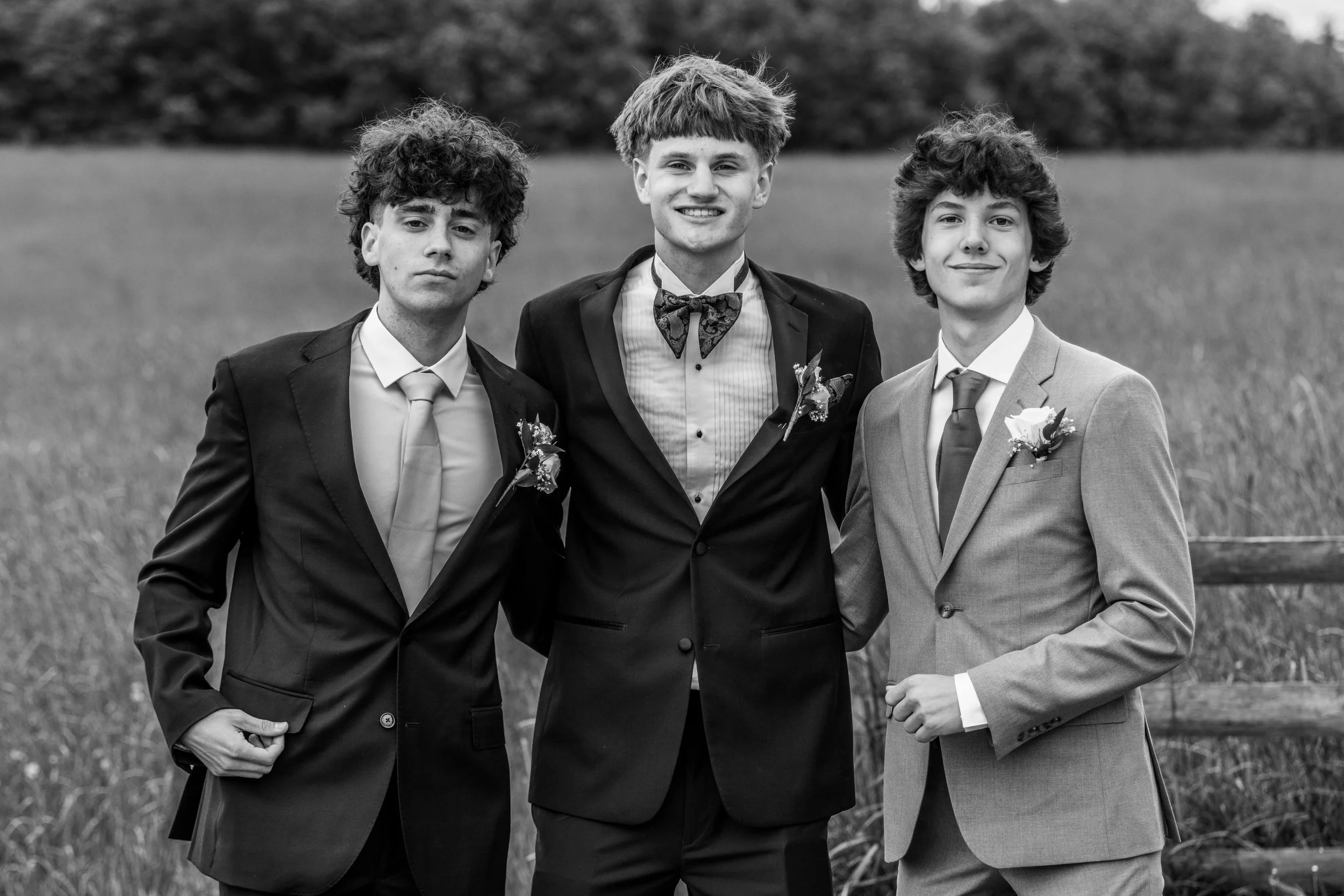 Three young men dressed in suits with boutonnieres, standing outside in a field.