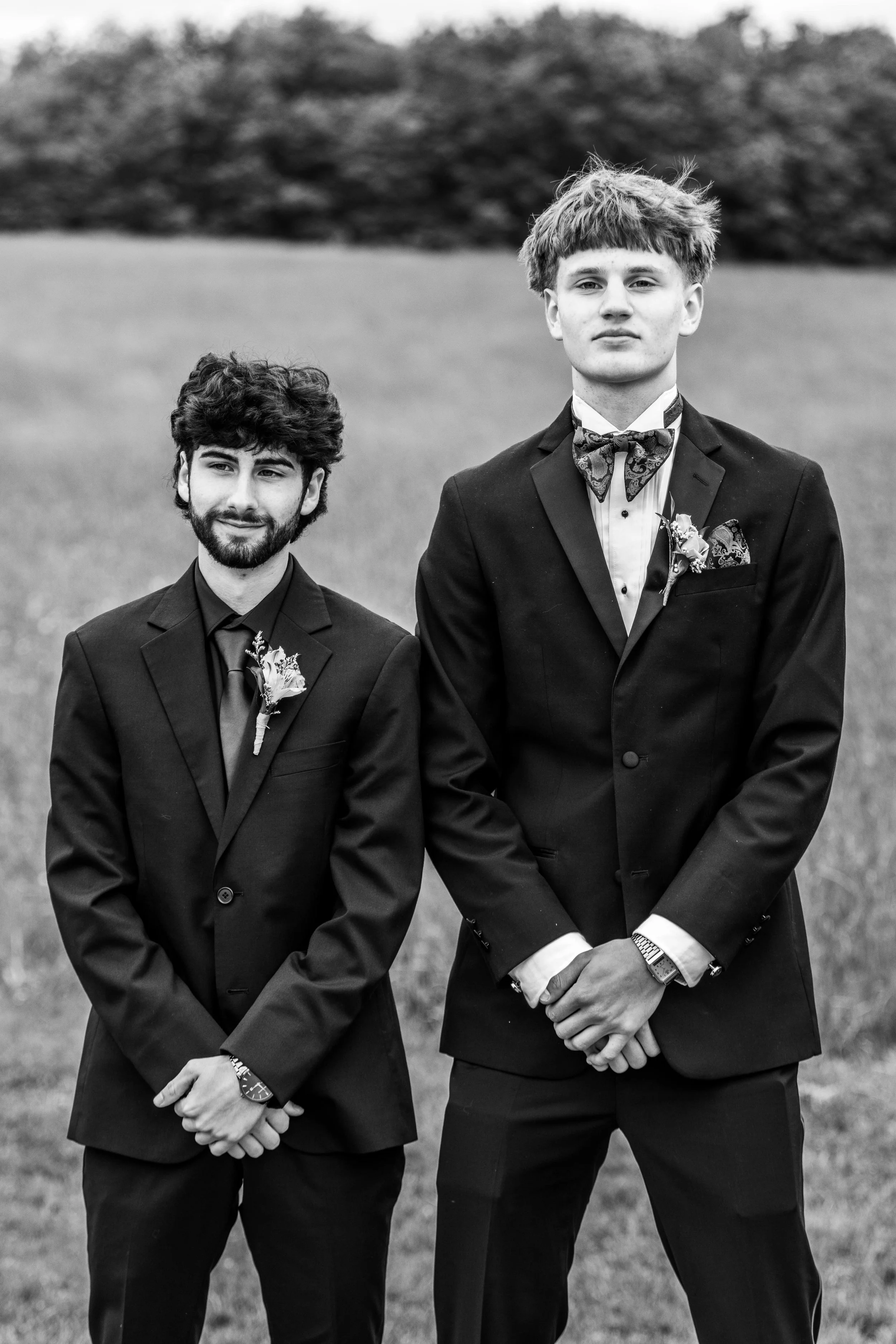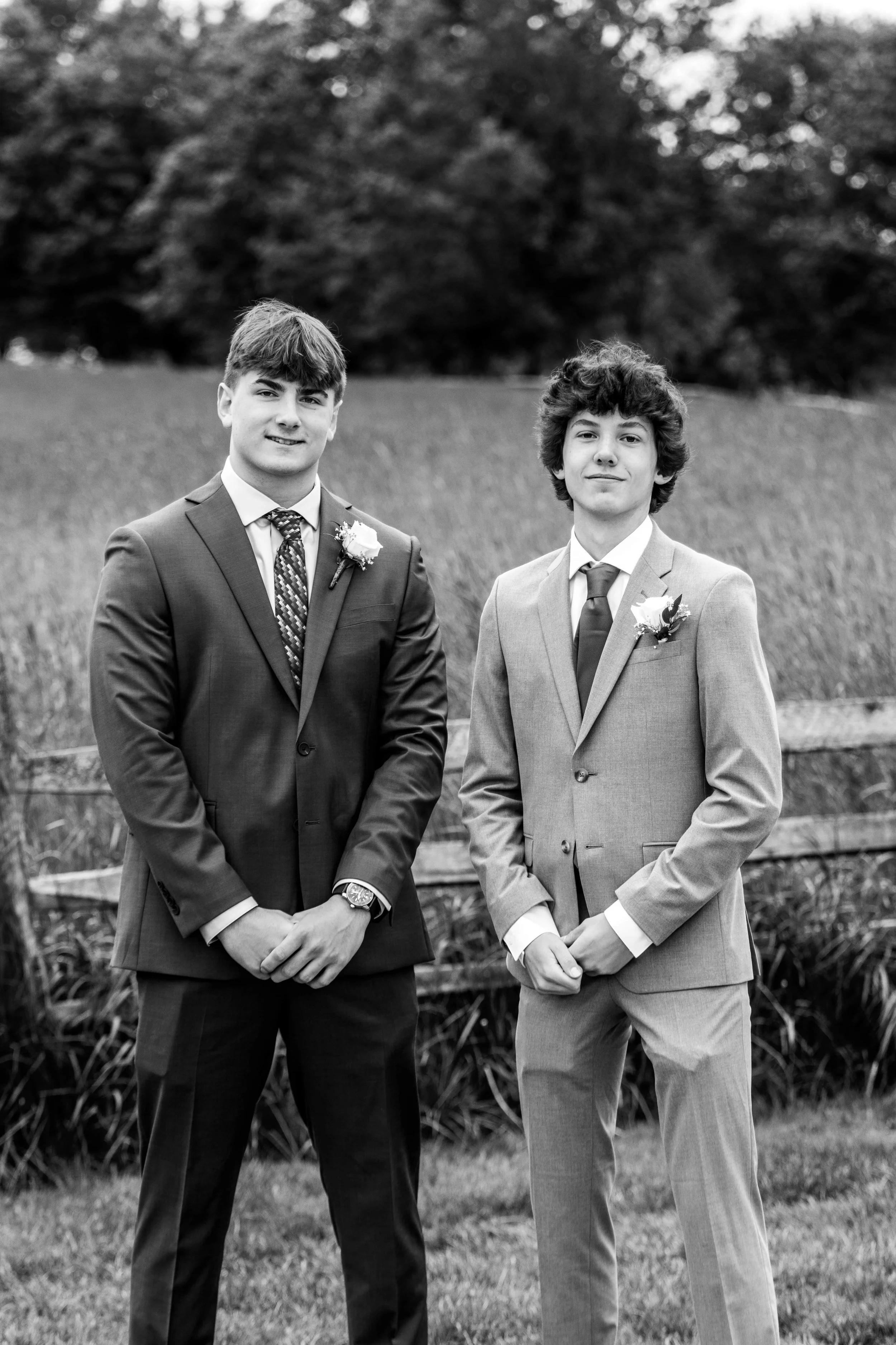 Two young men in formal suits standing outdoors on a grassy field, both with boutonnières, with a blurry background of trees.