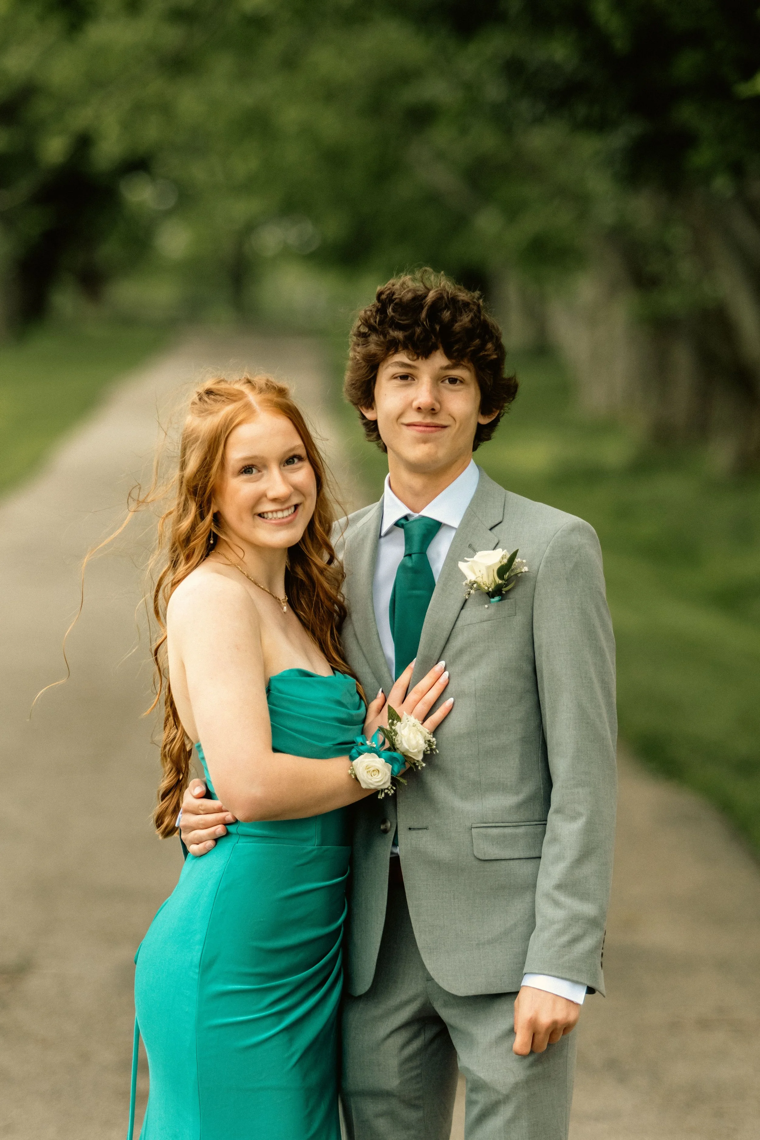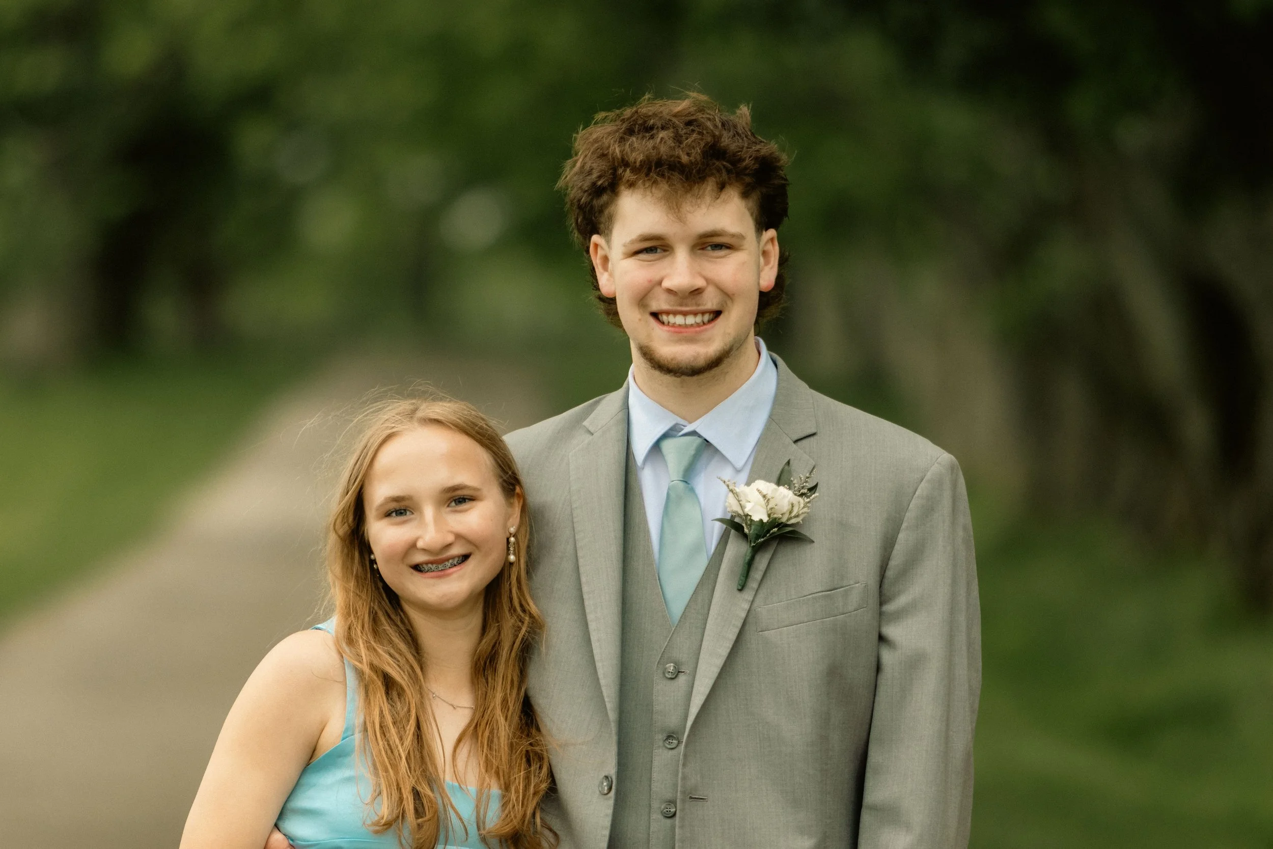 A young woman with long red hair and braces, and a young man with curly brown hair, smiling while standing outdoors on a path surrounded by greenery, dressed in formal attire for a special occasion.