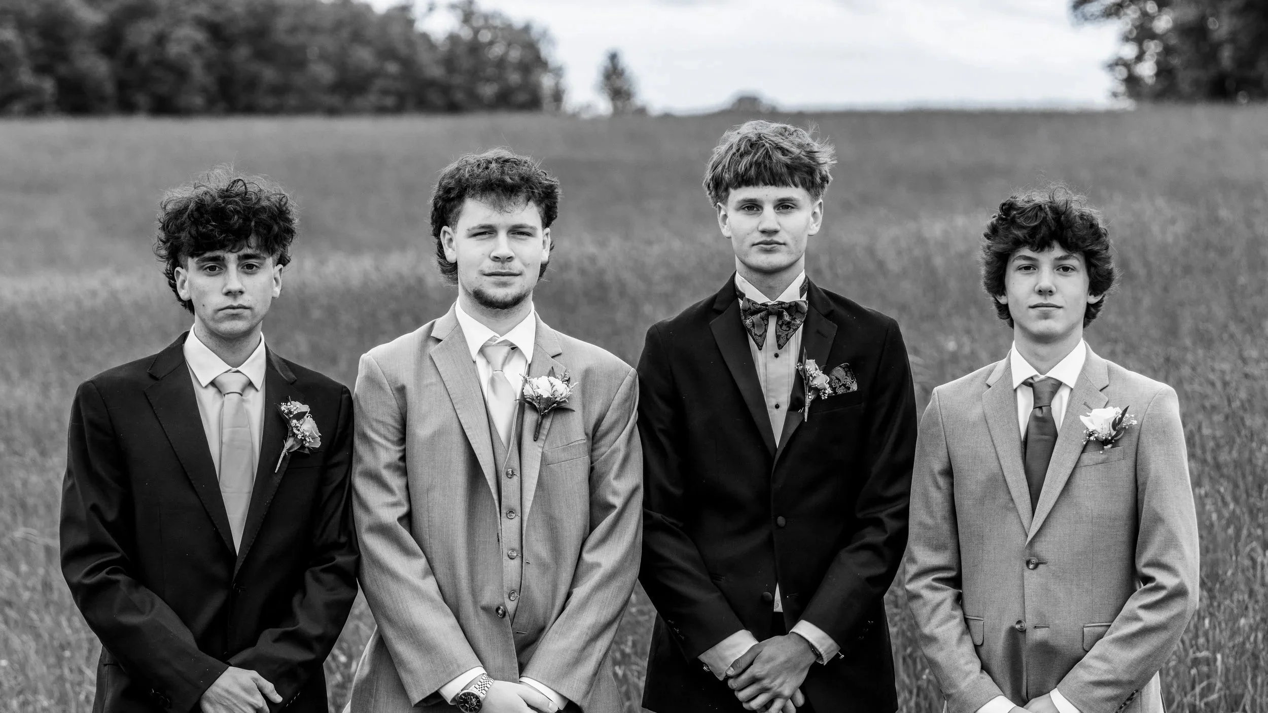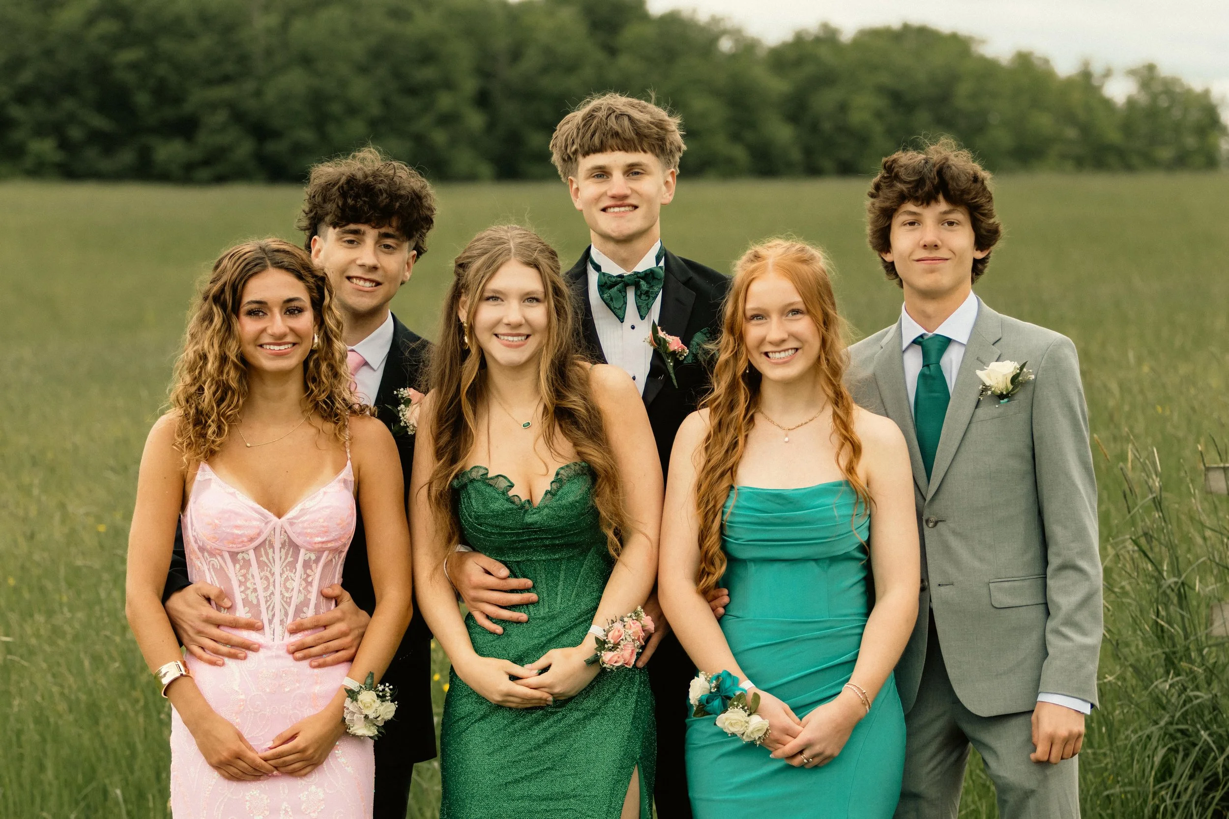Group of six young people dressed in formal attire standing outdoors in a grassy field with trees in the background.
