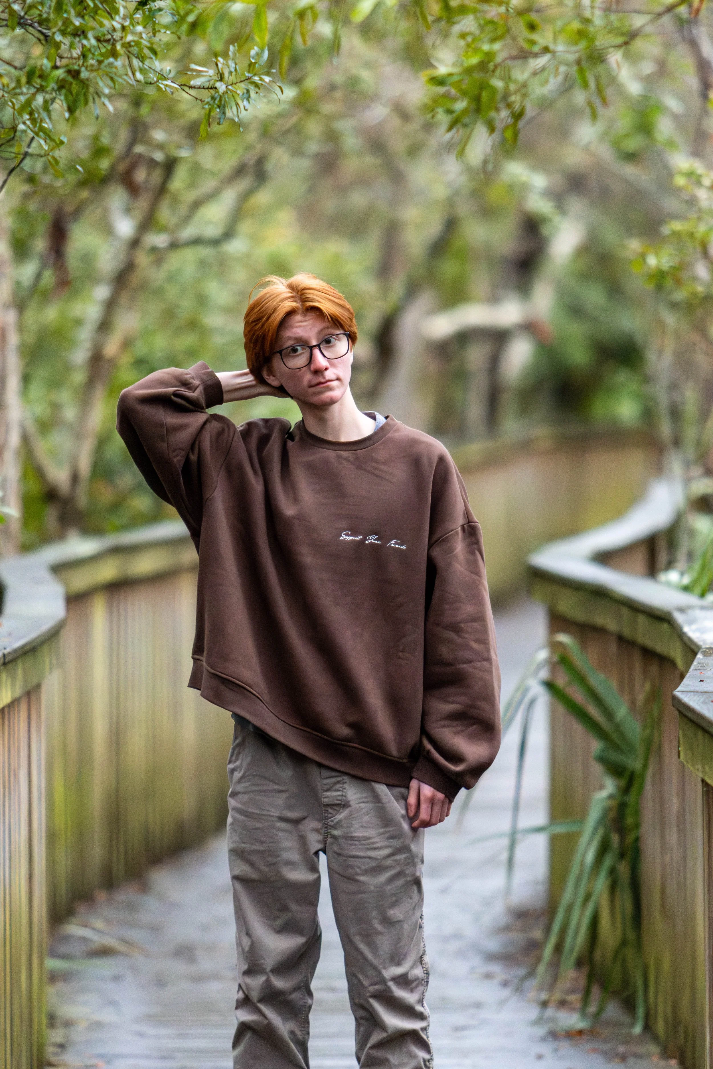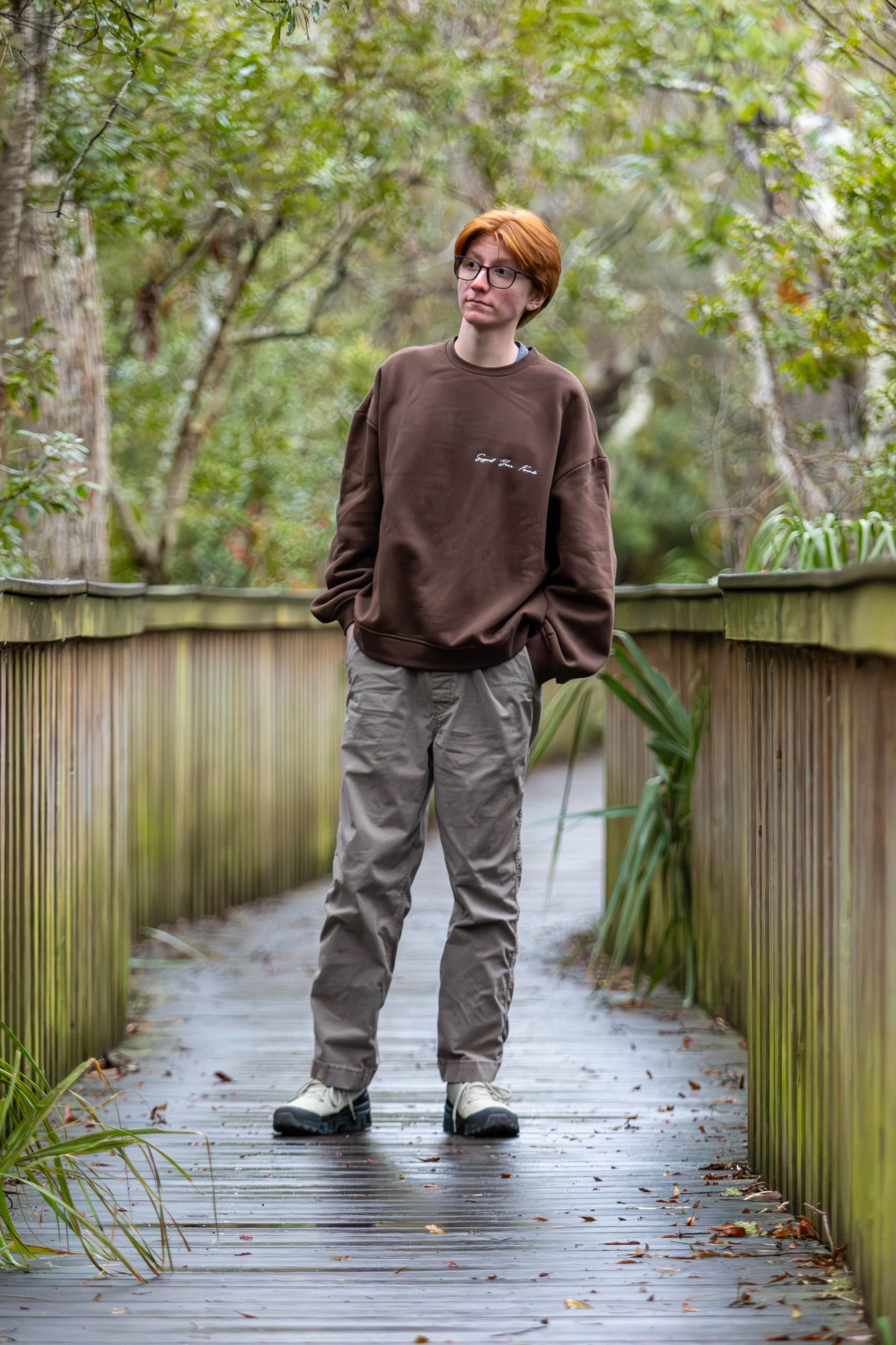 A young person with red hair and glasses standing on a wooden pathway outdoors, surrounded by green trees and plants, wearing a brown sweatshirt, beige pants, and hiking boots.