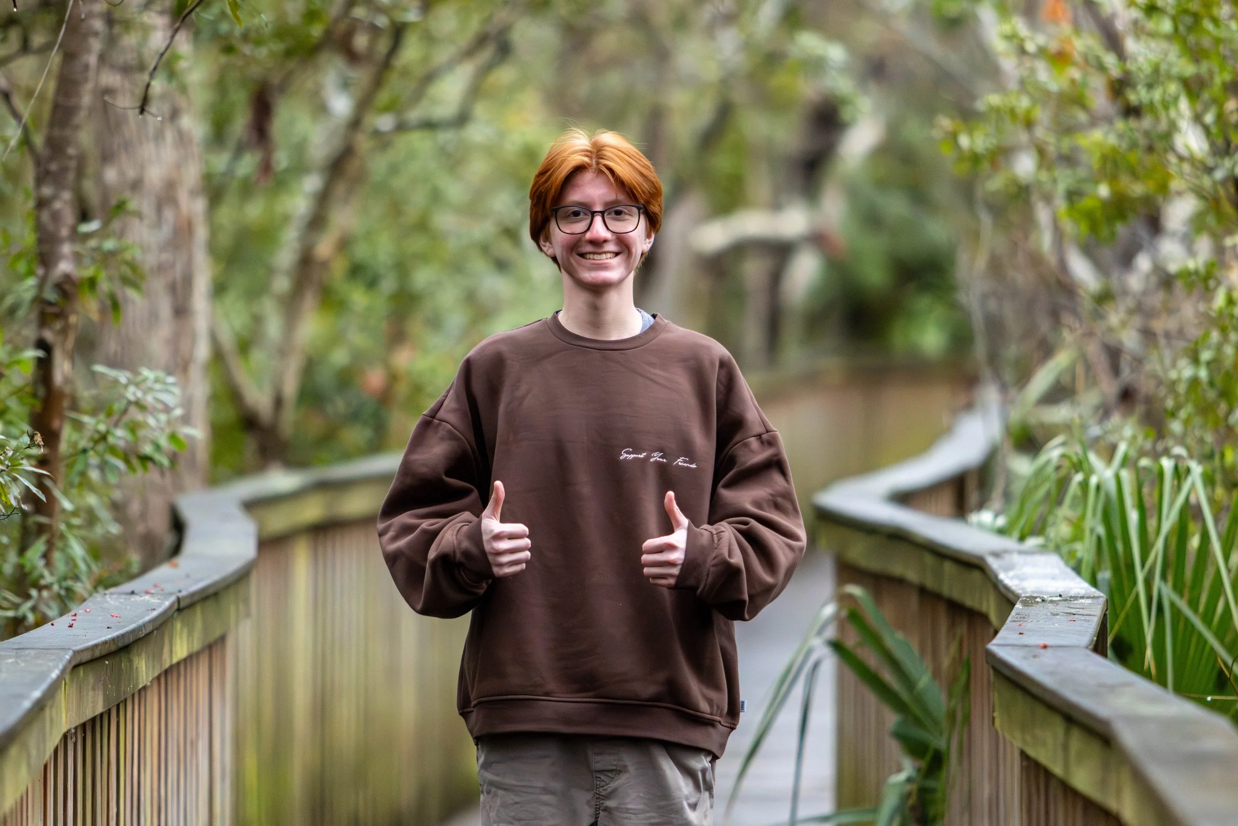 A smiling young person with short red hair, glasses, and wearing a brown sweatshirt, giving a thumbs-up while standing on a wooden walkway surrounded by greenery in a nature setting.