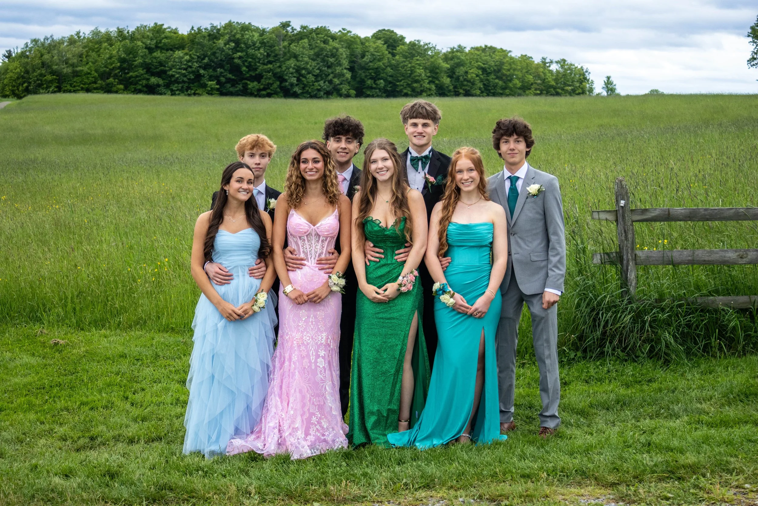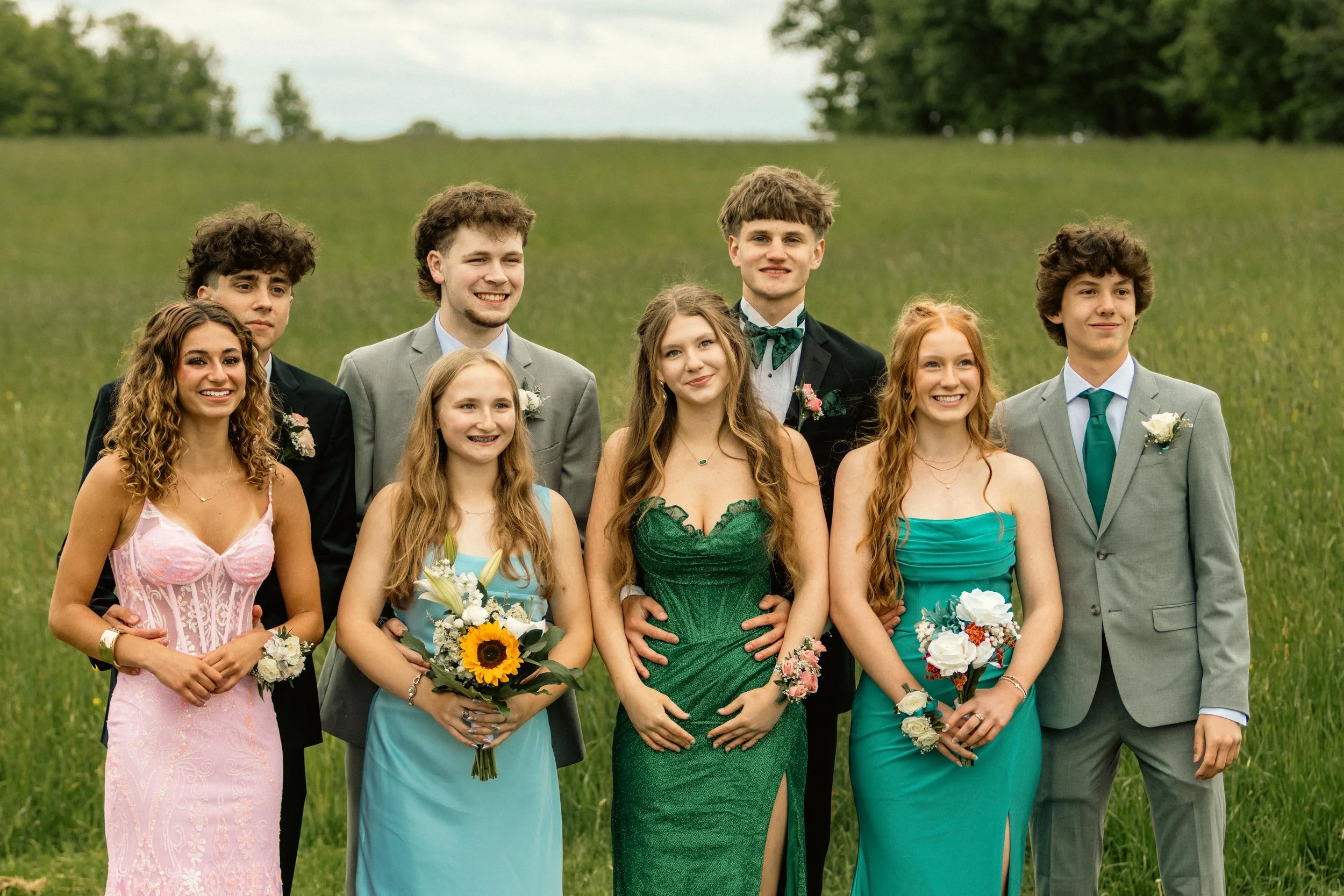 Group of nine teenagers dressed in formal attire standing outdoors in a field.