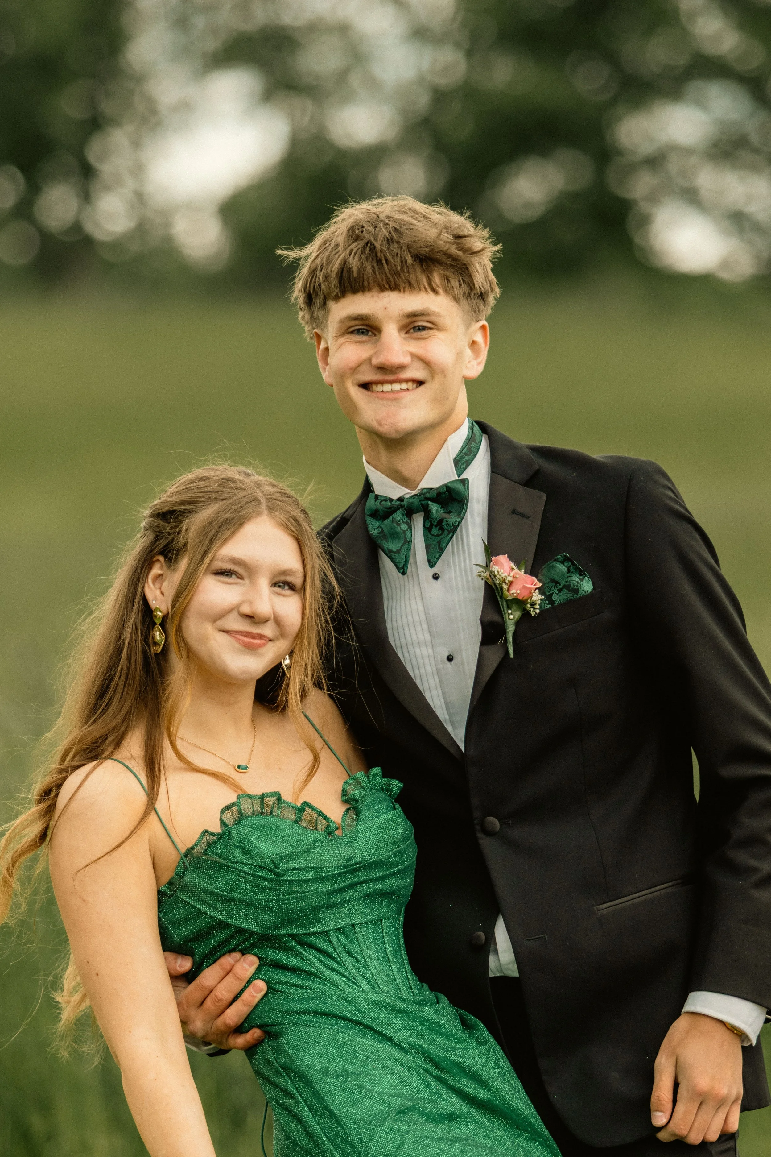 A young man in a tuxedo and a young woman in a green gown standing in a grassy outdoor area with trees in the background.