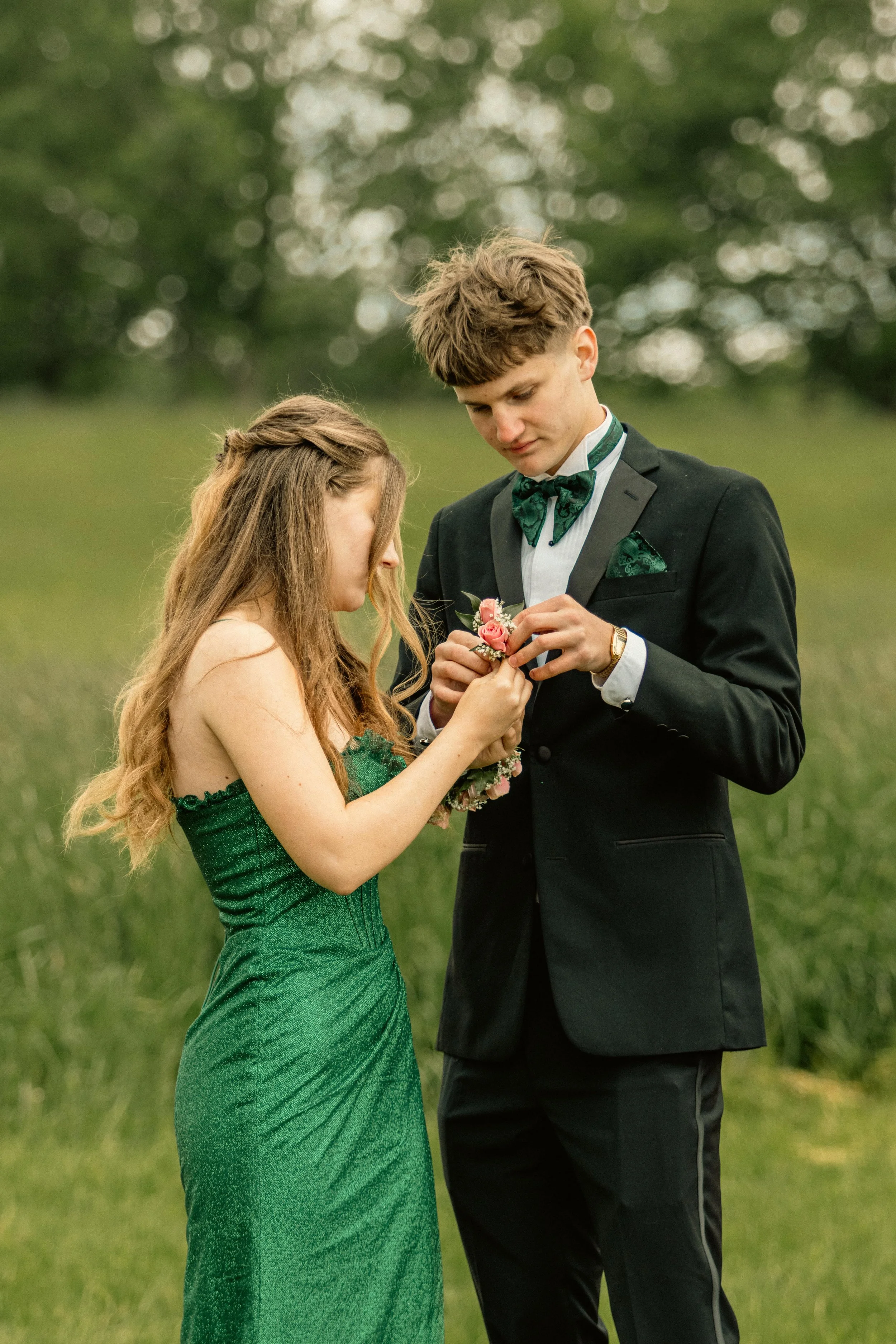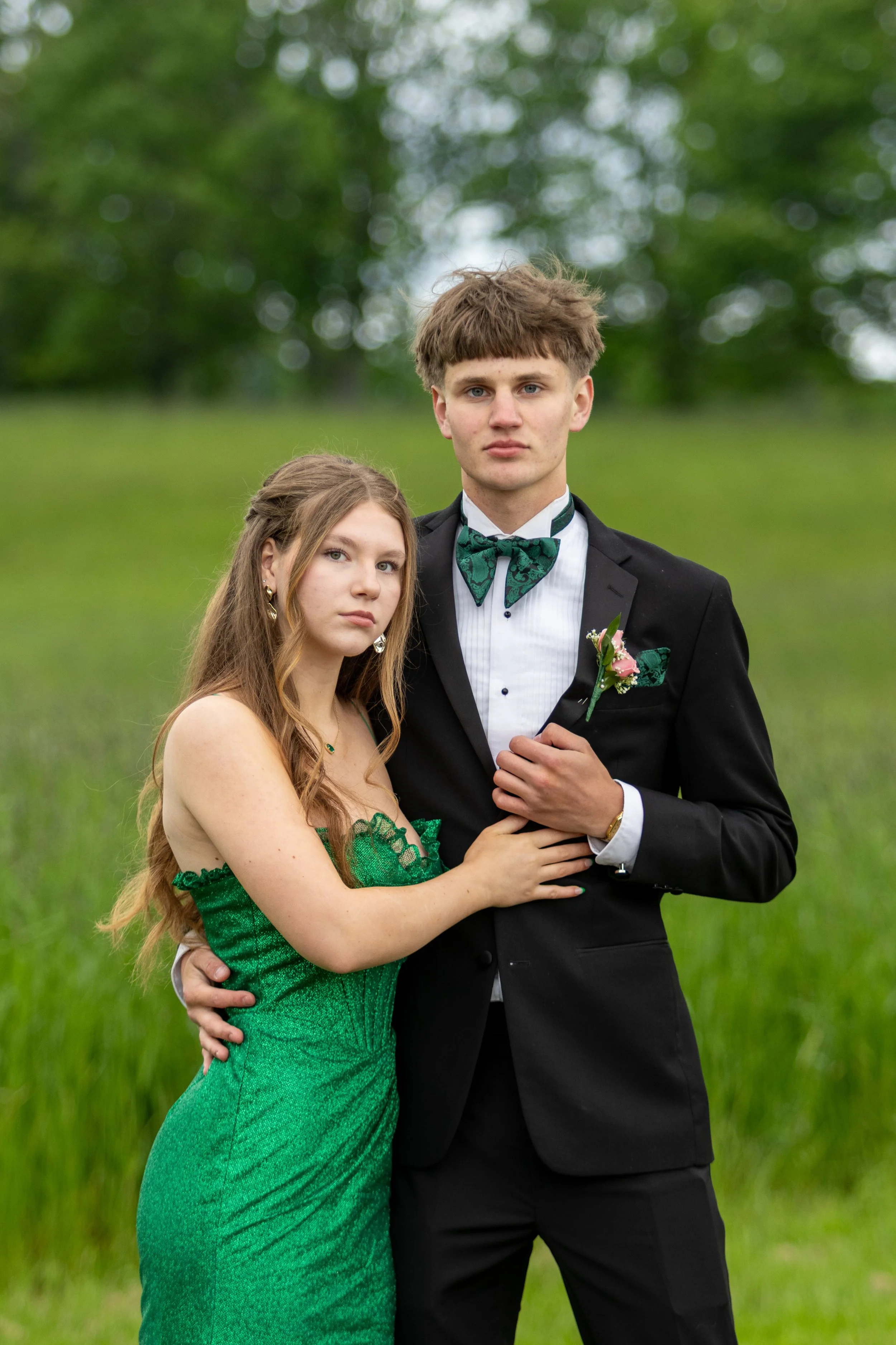 A young couple dressed in formal attire, standing outdoors on a grassy field with blurred trees in the background. The woman in a green dress and the man in a black tuxedo with a green bow tie.