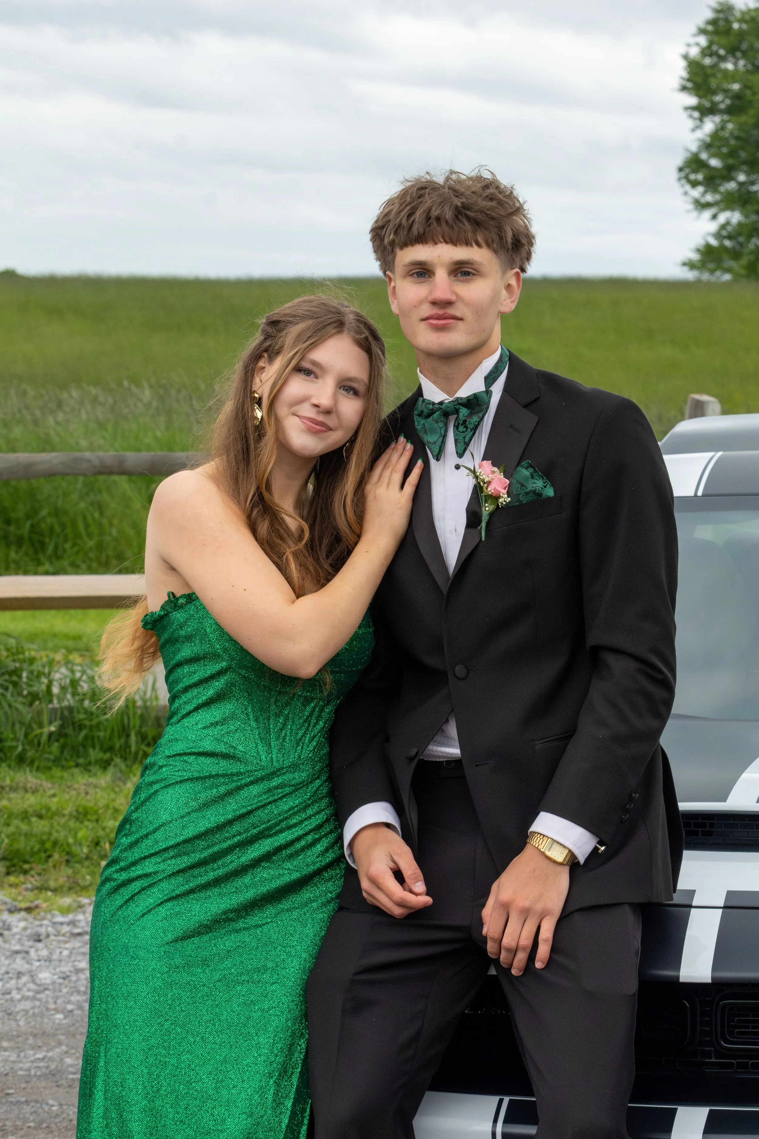 A young woman in a green dress and a young man in a tuxedo with a green bow tie and boutonniere stand outdoors, posing for a photo near a car.