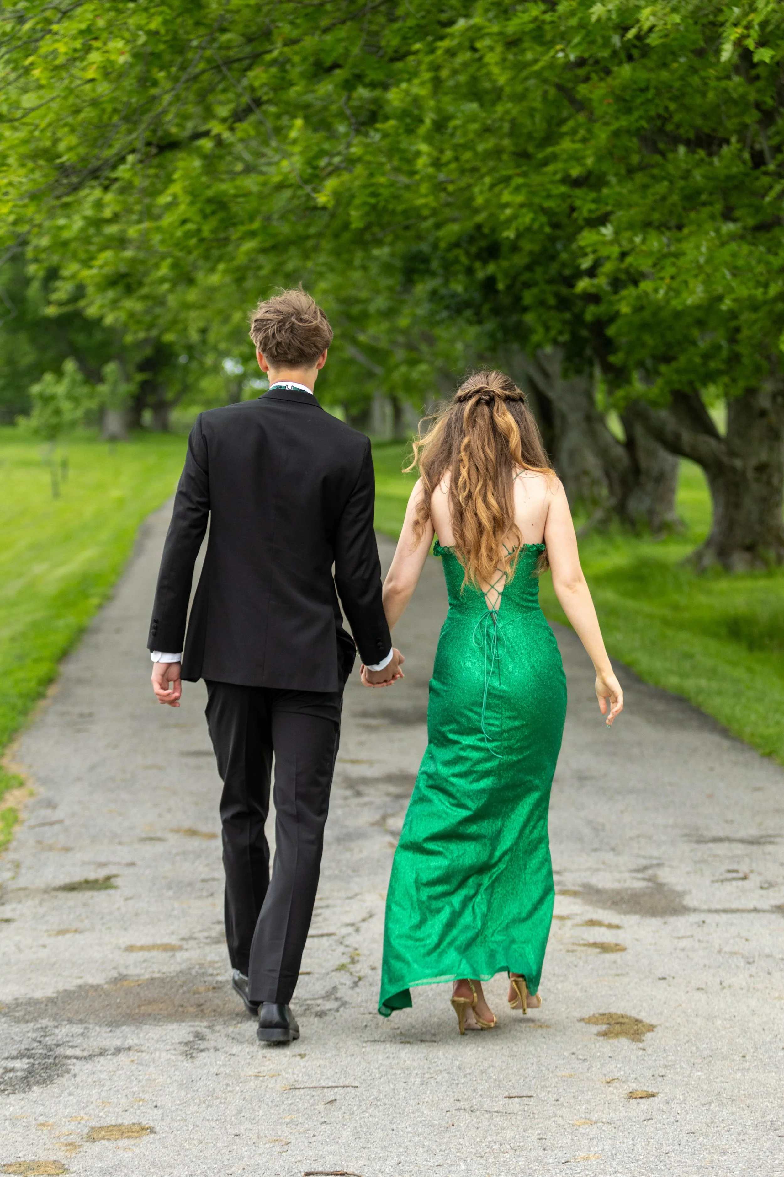 A young man and woman dressed in formal attire posing outdoors on a path with green trees in the background. The man is wearing a black tuxedo with a green bow tie, and the woman is in a green evening gown with a high slit and floral wrist corsage.