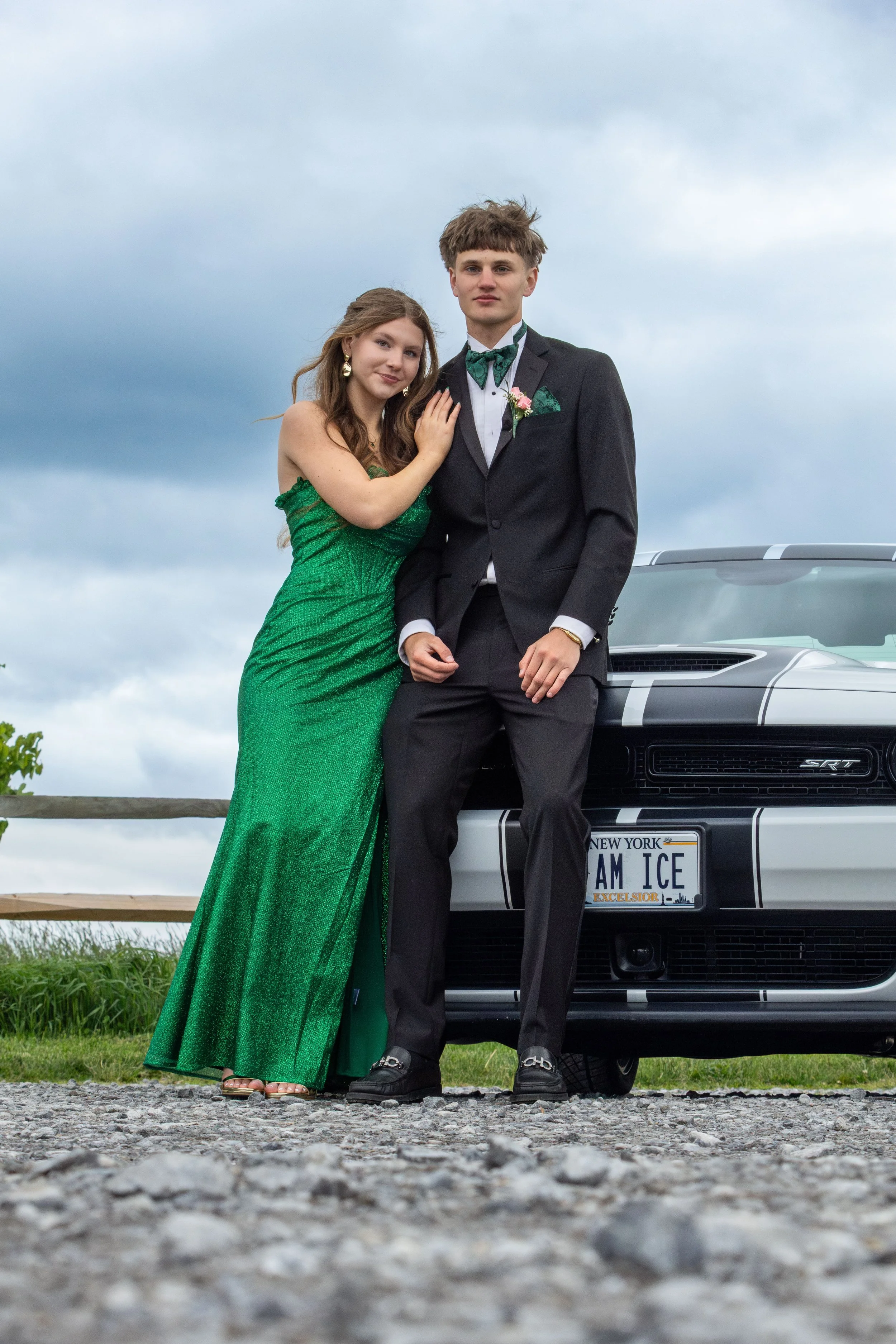 A young couple dressed in formal attire outdoors, with the woman in a green dress and the man in a black suit, standing in front of a black sports car with a New York license plate.