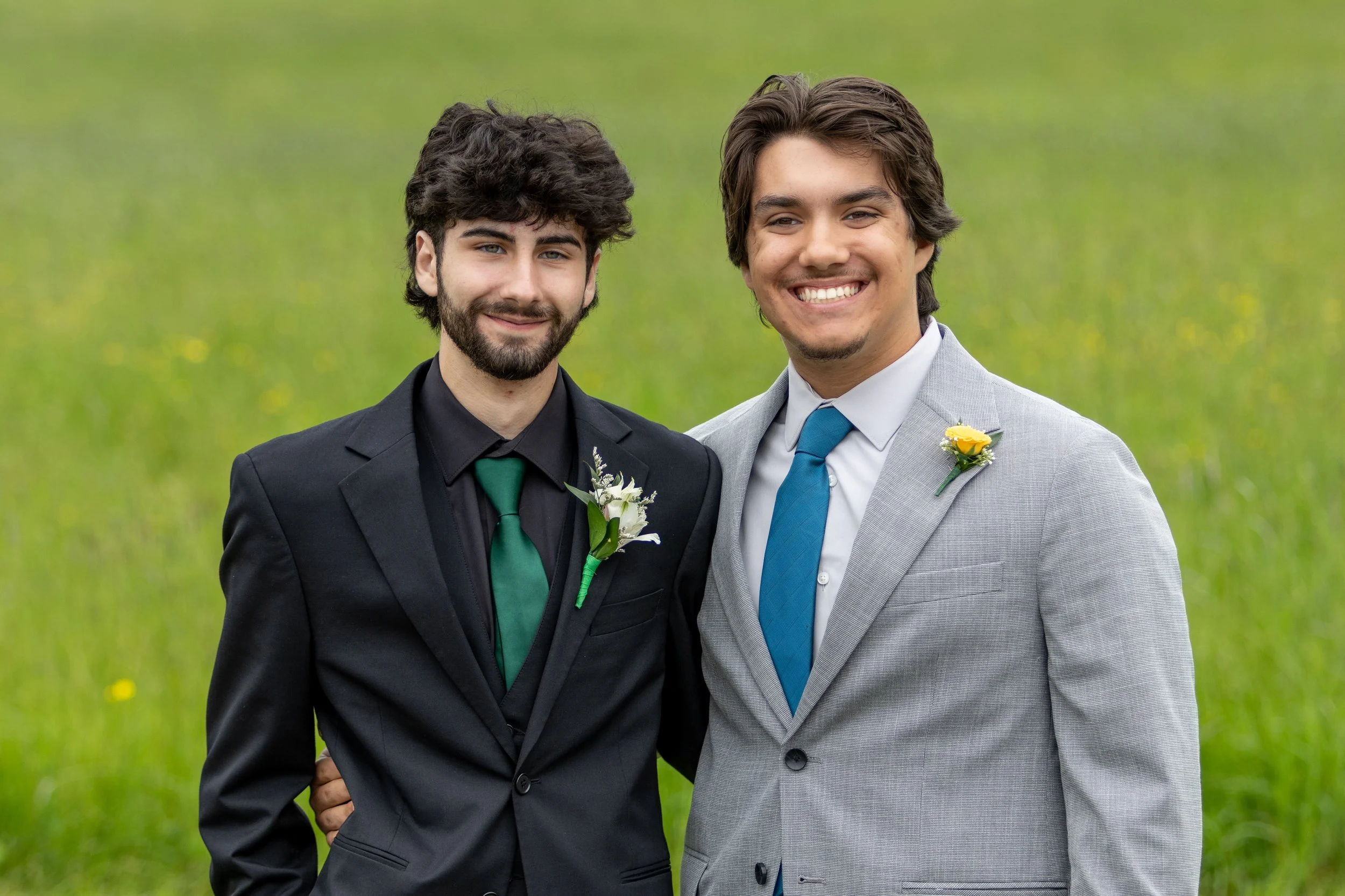 Two young men dressed in suits, standing outside on a grassy field. They are smiling, with one in a black suit with a green tie and boutonniere, and the other in a gray suit with a blue tie and boutonniere.