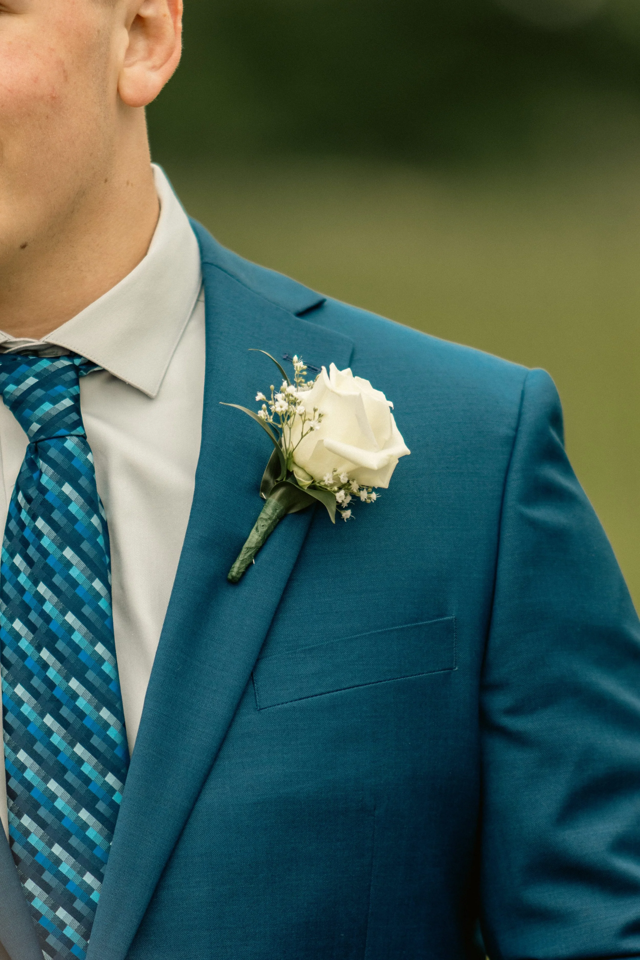 Close-up of a man dressed in a teal suit with a white shirt and a blue patterned tie, wearing a white boutonniere on his lapel.