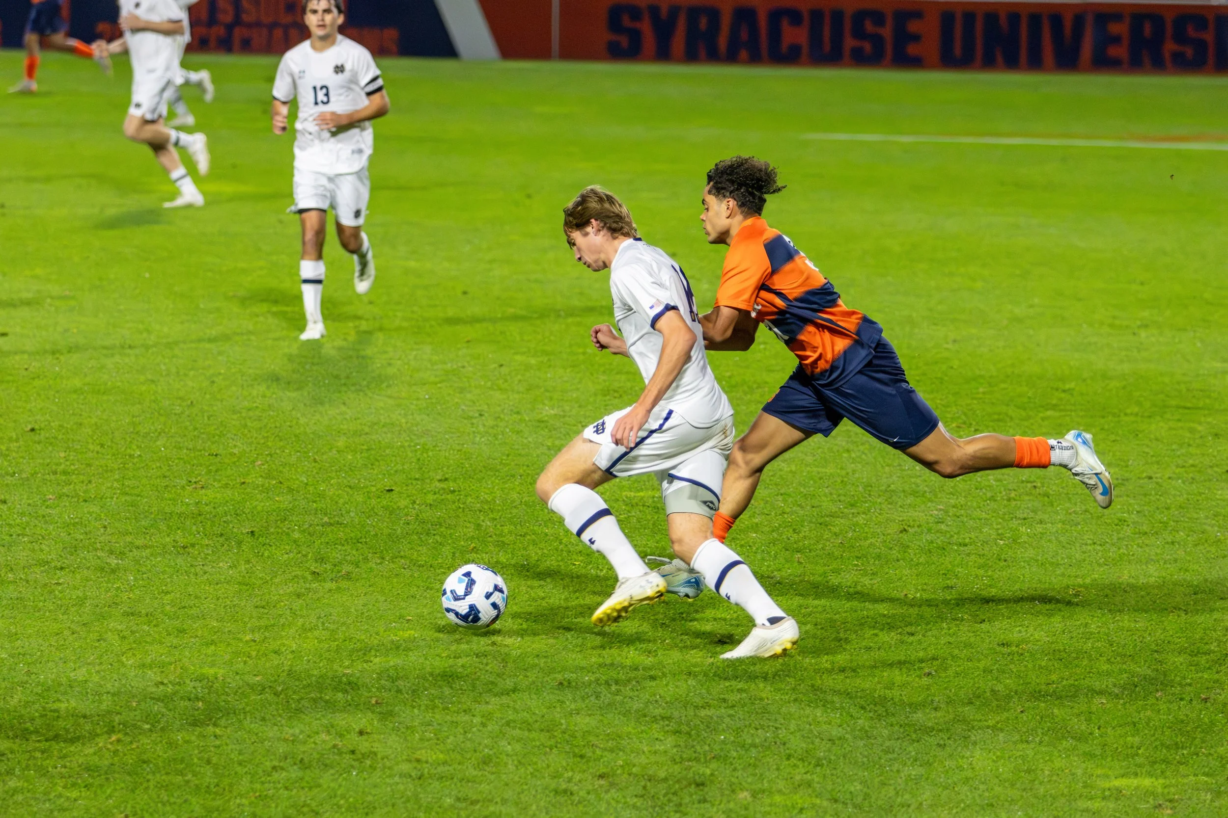 Soccer players celebrating on the field after scoring a goal at night, wearing orange and navy uniforms with 'Syracuse' written on them.