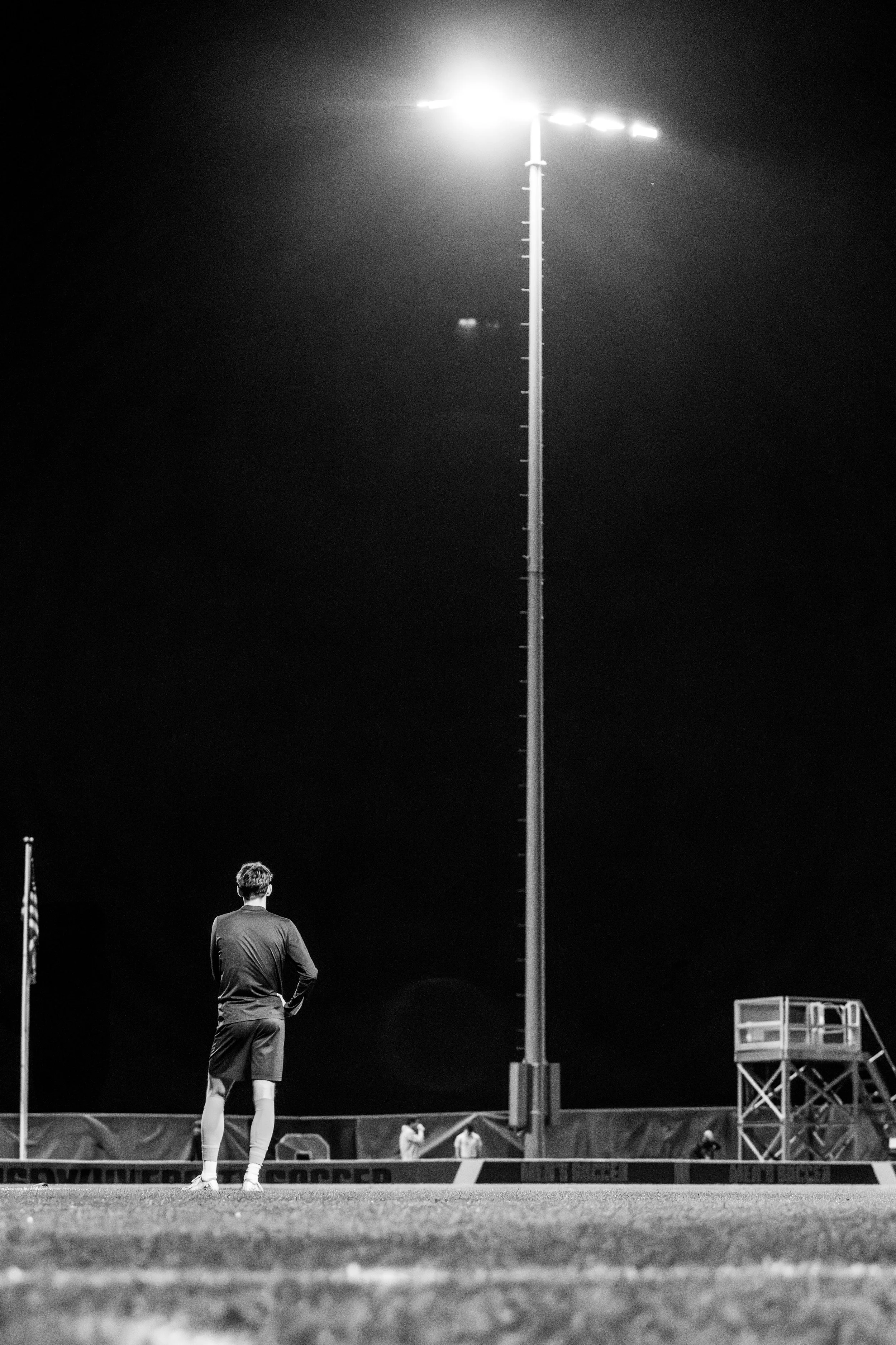A person standing on a sports field at night, illuminated by a tall floodlight, with a few other people in the background and an American flag to the side.